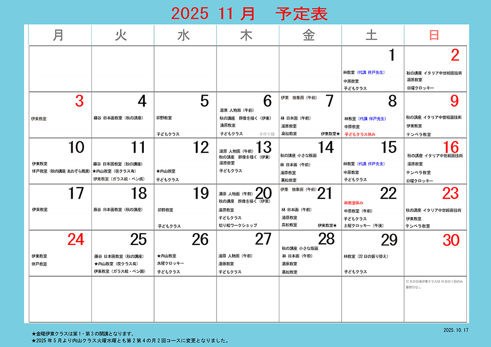 子どもクラス土曜日は、11/8がお休み、29日が教室日になります。