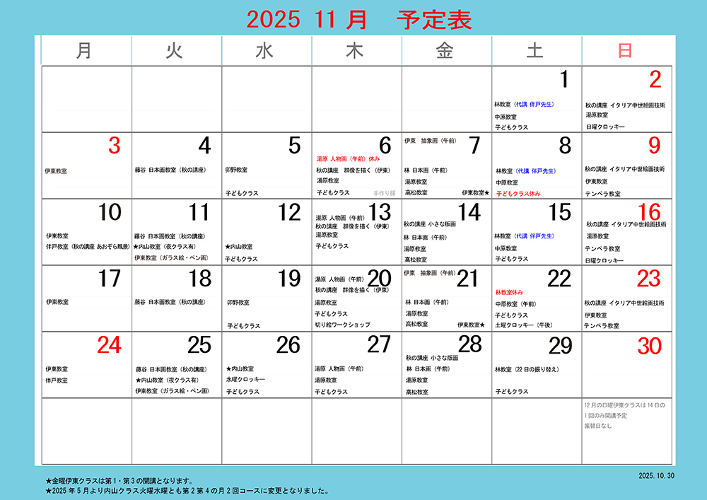 彩光舎絵画教室11月の教室・講座の日程です。