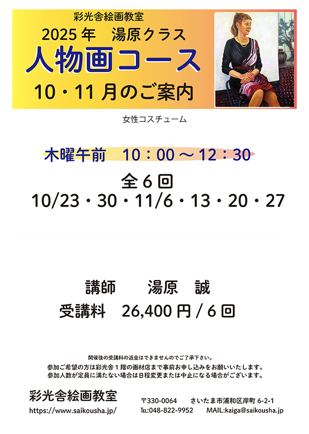 木曜人物画講座後期Bのスタートは11/23に変更となりました。