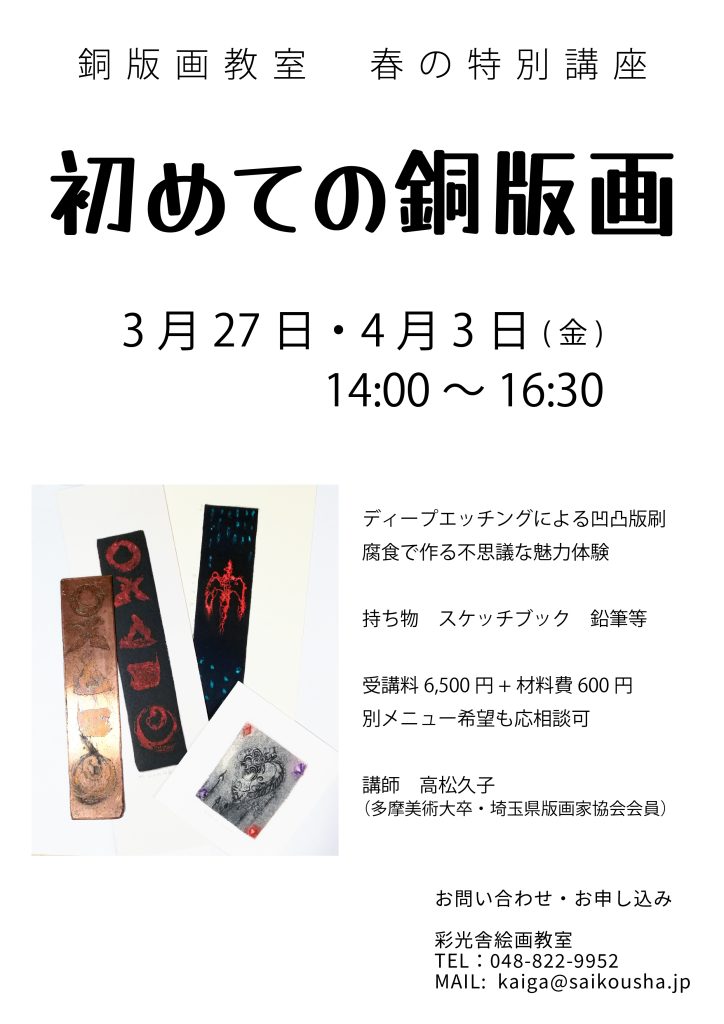 彩光舎絵画教室 銅版画教室では春の特別講座として、「初めての銅版画」講座を開講いたします。